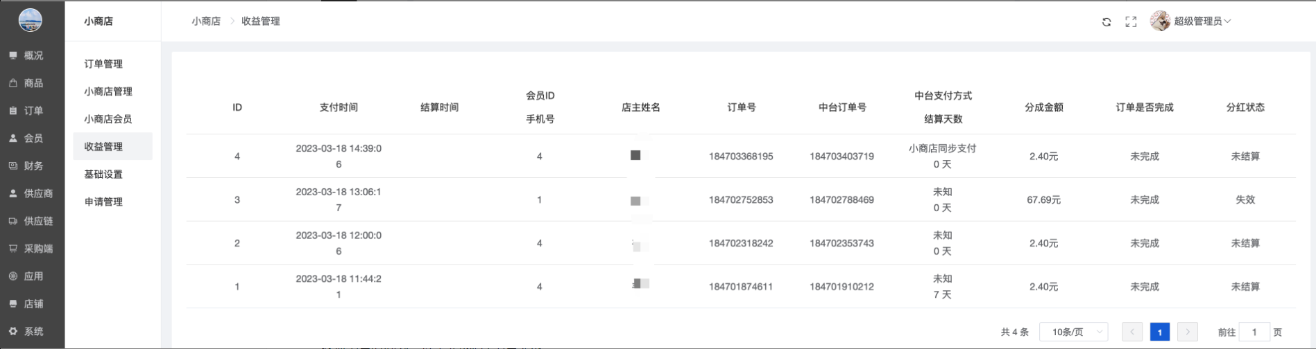 显示所有的小商店列表,支持查看小商店订单、收益等。