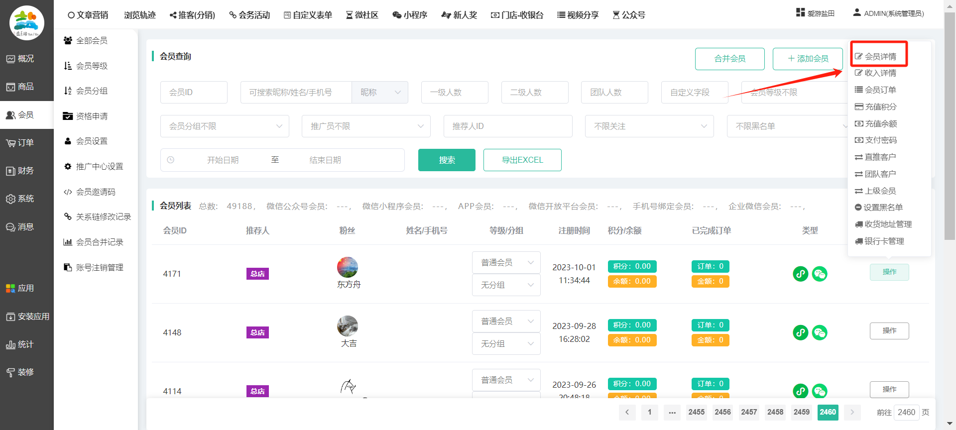 目录 搜索 展开 一、前期准备资料二、数字乡村码-上线操作指南1、服务号的申请流程及认证2、申请小程序流程3、开放平台绑定小程序和公众号三、数字乡村码-系统操作数字乡村码系统管理-概况数字乡村码-商品管理1、发布商品2、商品列表3、商品表单4、商品分类5、品牌管理6、配送模板7、评论管理8、优惠券管理9、商品标签10、退货地址设置11、满额优惠12、批量操作13、配送方式14、基础设置15、商品隐藏四、数字乡村码-会员管理1、全部会员2、会员等级3、会员分组4、资格申请5、会员设置6、推广中心设置7、会员邀请码8、会员关系链修改关系链修改记录9、会员合并记录10、账号注销管理11、会员设置中心五、数字乡村码-订单管理1、订单管理列表2、订单处理流程3、订单状态4、订单修改价格5、订单退款退货6、多包裹发货7、批量发货订单操作步骤8、催发货订单9、物流查询六、数字乡村码-财务管理1、余额设置2、会员余额3、充值记录4、转让记录5、余额明细6、收入明细7、提现设置8、提现统计9、积分管理10、转账审核11、收益广告12、批量充值七、数字乡村码-系统管理1、商城入口2、商城设置①、商城设置②、订单设置③、物流查询④、短信⑤、联系方式⑥、分类⑦、优惠券⑧、分享⑨、幻灯片⑩、广告位⑫、地图设置3、交易设置4、微信模板消息自定义消息模板(新版)自定义消息模板(旧版)小程序消息模板公众号模板消息变更公告5、语言设置6、权限管理7、多媒体管理八、数字乡村码-消息管理九、数字乡村码-应用管理十、数字乡村码系统-数据统计十一、数字乡村码-页面装修DIY1、模板管理2、店铺页面3、顶部导航4、底部导航5、DIY模板市场6、首屏广告7、基础设置8、装修DIY尺寸建议十二、供应商功能插件操作指南1、供应商2、门店-收银台门店申请和使用步骤门店管理①、门店-收银台 营销设置②、门店-收银台 分润设置门店分类门店申请门店审核门店商品门店商品订单收银台订单数据统计核销员基础设置默认设置门店装修3、微社区4、会务活动十三、营销插件操作指南活动报名提货卡新人奖微店问卷调查积分视频分享1、视频分享基础设置2、视频分享发现管理3、视频分享分类管理4、视频分享评论管理5、视频分享分红记录6、视频分享短视频中心每日红包幸运大抽奖签到优惠券二维码任务奖励优惠劵文章音频文章付费文章限时购新海报拓客卡操作流程积分活动素材中心视频红包十四、入驻门店应用类1、门店预约2、附近商品3、门店定位设置4、门店控制5、门店满额包邮6、门店满额减7、导入商品8、门店搜索9、门店股东10、核销券11、多门店核销1、商城后台设置2、前端功能演示十五、常见问题1、后台登录密码修改流程2、会员-余额,积分,后台如何进行充值与扣除3、如何修改上下级关系4、一种万能的获取商城小程序路径的方法 暂无相关搜索结果! 阅读次数:1551 本文档使用 模王系统 发布 8、会员关系链修改 8、会员关系链修改一.如何修改上下级关系?1.会员-全部会员-可以通过搜索用户的独立ID,或者用户微信昵称,找到此会员,然后点击右边的(操作)2.再点击会员详情。3.滑到下面,有个推广信息-会员上线,点击修改4.输入上级的ID号,点击搜索,出来此上级会员后点击选择。5.滑到最下面,一定要点击提交按钮。文档更新时间: 2023-11-30 14:56 作者:链上旅行